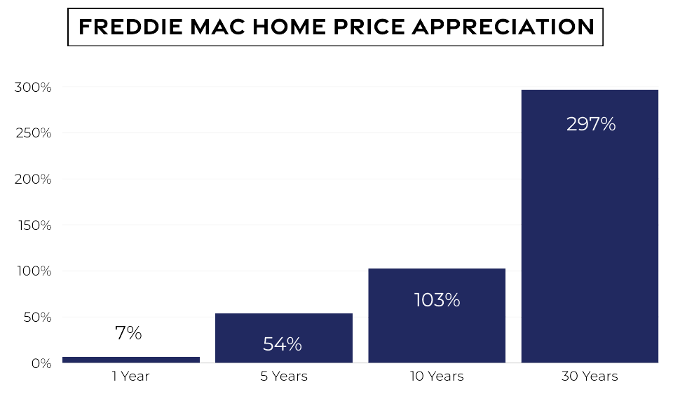 According to Freddie Mac, the 43-year average home price appreciation is 4.86%, and their outlook over the next 30 years is incredible.