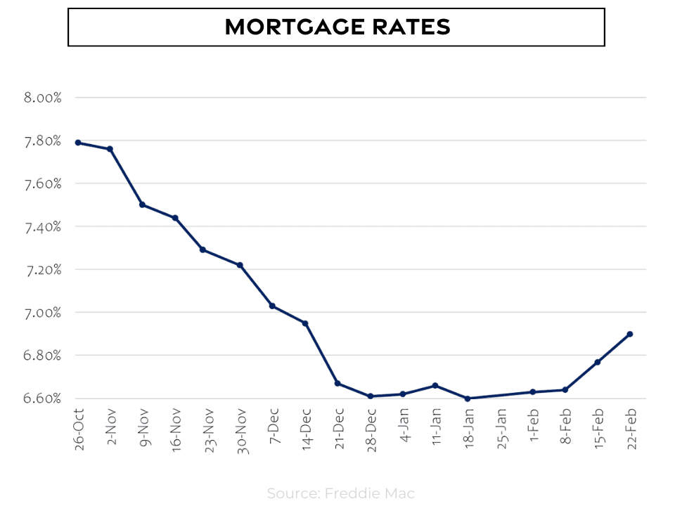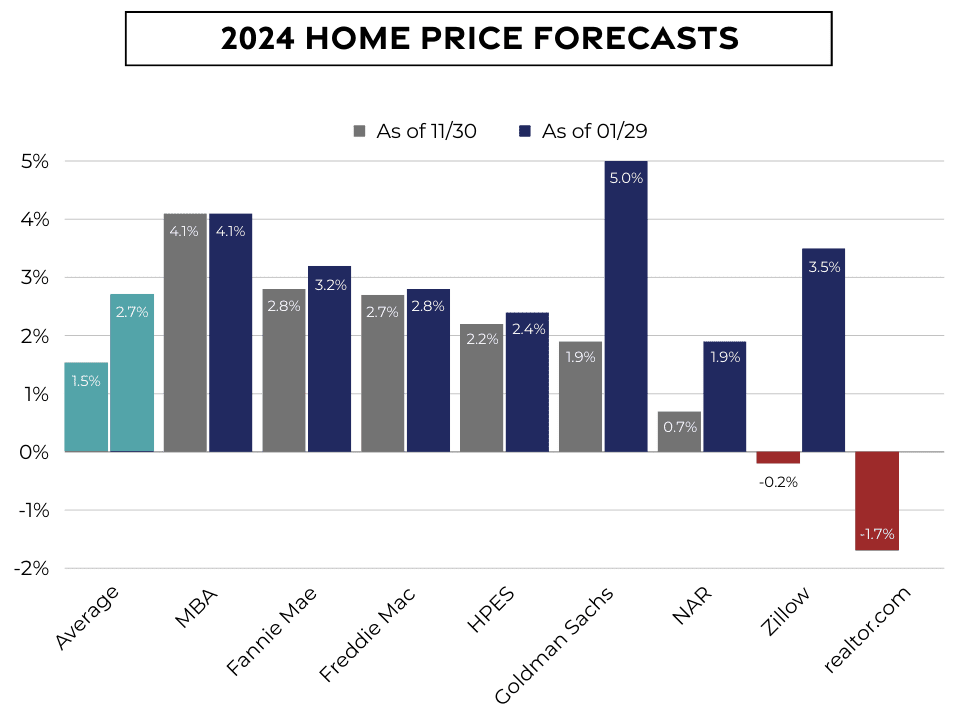 Just a month ago the latest expert projections on home price appreciation for this year averaged 1.5%, and our 2024 forecast last month of 3% seemed aggressive. However, since then, we’ve seen a strong start to 2024, and that average has increased to 2.7%.