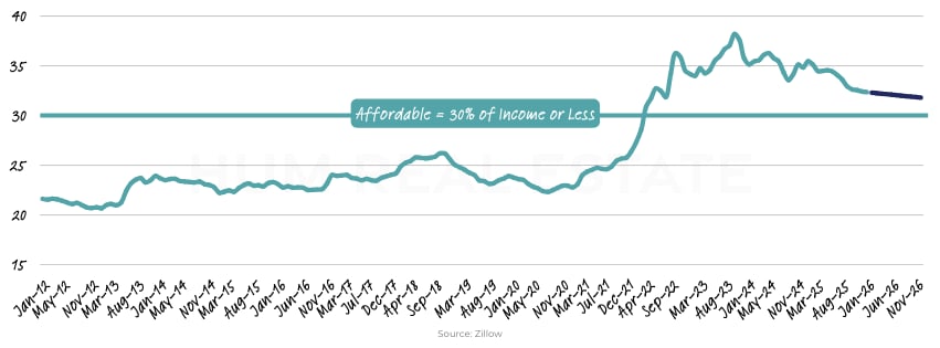 What happened after the pandemic is that affordability eroded as we saw higher prices and increasing mortgage rates. The peak of unaffordability occurred in October 2023, and since then we have been on a rocky road trying to get back to where people are spending 30% or less of their income on a home.