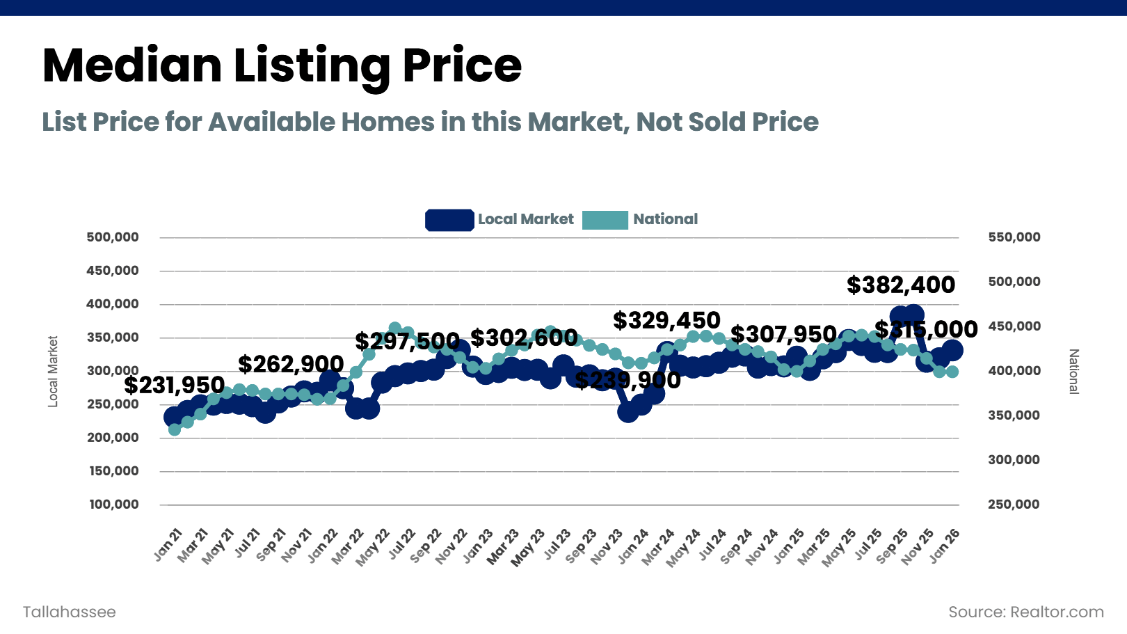 If you have owned your home for years, and especially for decades, there is a good chance you have built up substantial equity. In Tallahassee, the median listing price was around $231,950 in January 2021 and had risen to $315,000 by January 2026, with even higher points along the way. That kind of long-term price growth, combined with years of mortgage paydown, has created real equity for many local homeowners.