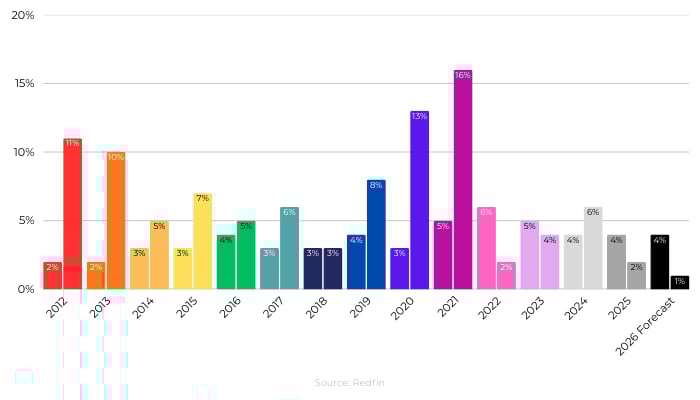 Home prices are not expected to rise as quickly – with 14 industry leaders predicting a 1.6% increase in home prices in 2026.