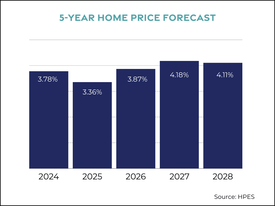 And what lies ahead for the next 5 years? For that we look to the Home Price Expectations Survey (HPES). The HPES is a nationwide panel of over 100 economists, real estate experts, and investment & market strategists. Their 5-year forecast calls for healthy appreciation through 2028.