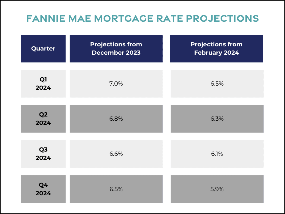 In December, Fannie Mae projected out the mortgage rates for 2024. However, those projections were adjusted in February.