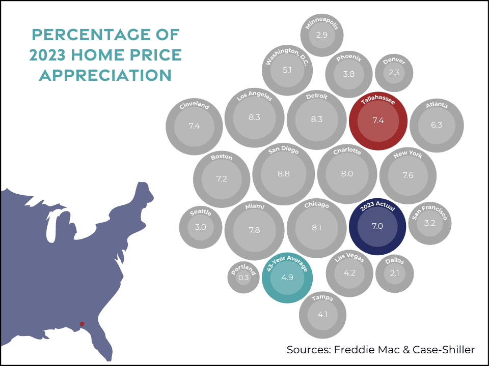 In Tallahassee, we saw a 7.4% increase in home prices from 2022 to 2023. That’s outstanding, considering that everyone was saying the sky was falling.