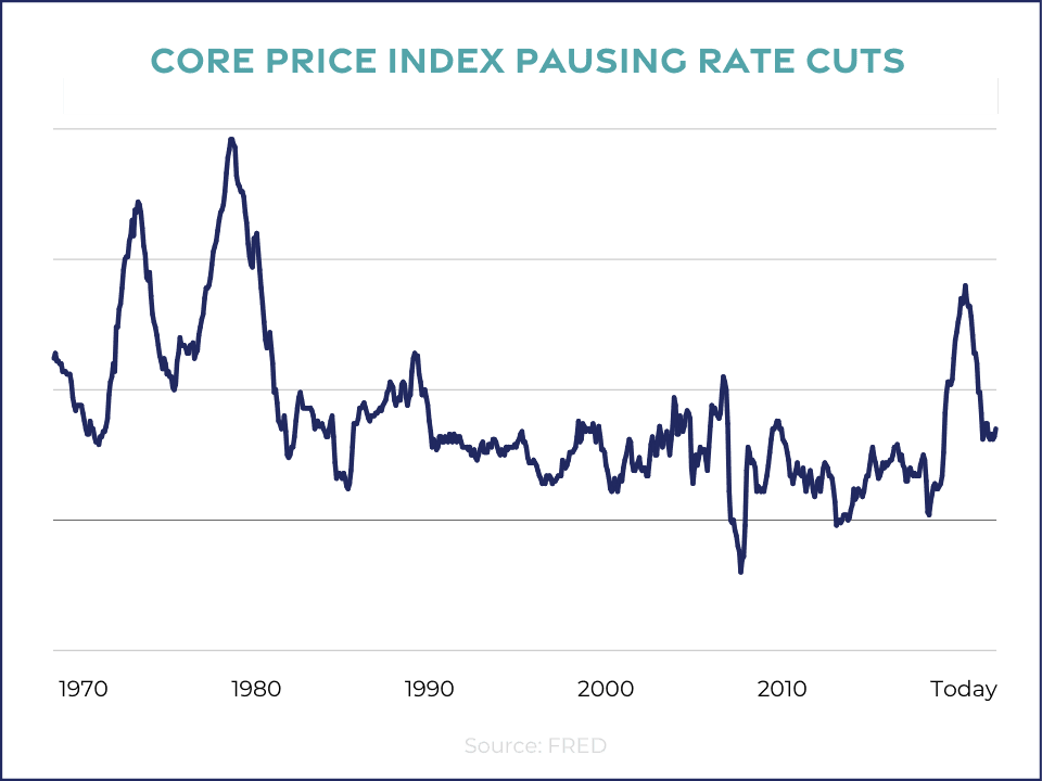 When they cut too early, inflation spikes back up and they have to start all over again. We do not want to be in that position today. Fast forward to today: inflation was rising, the federal funds rate was increased, inflation started to come down, the last couple of readings came in just a touch higher than expected. The Fed does not want to repeat history. They are buying a little bit more time to make sure they're really seeing those consistent trends of a slowing in the economy.