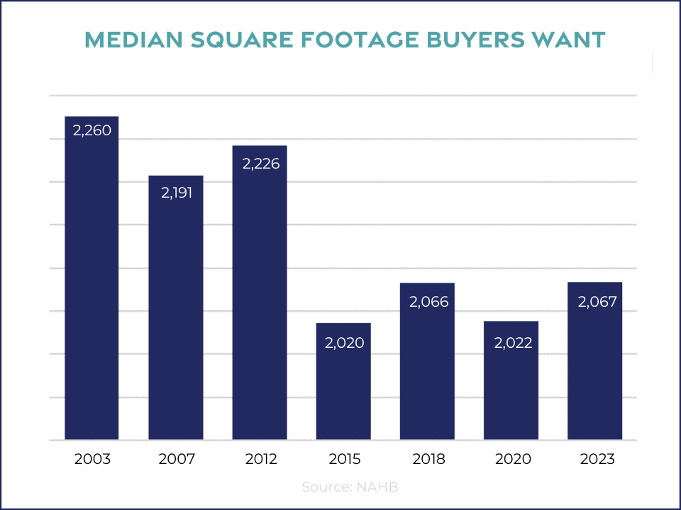 It is clear that homes are less affordable today than they have been, looking all the way back to 1990. A combination of rising prices, coupled with rising mortgage rates, makes affordability one of the market’s biggest concerns right now. However, builders are responding. One of the solutions they have recognized is building smaller homes. 38% of builders said they built smaller homes in 2023, and 26% have plans for smaller homes this year. There is a clear trend that buyers are interested in smaller homes.