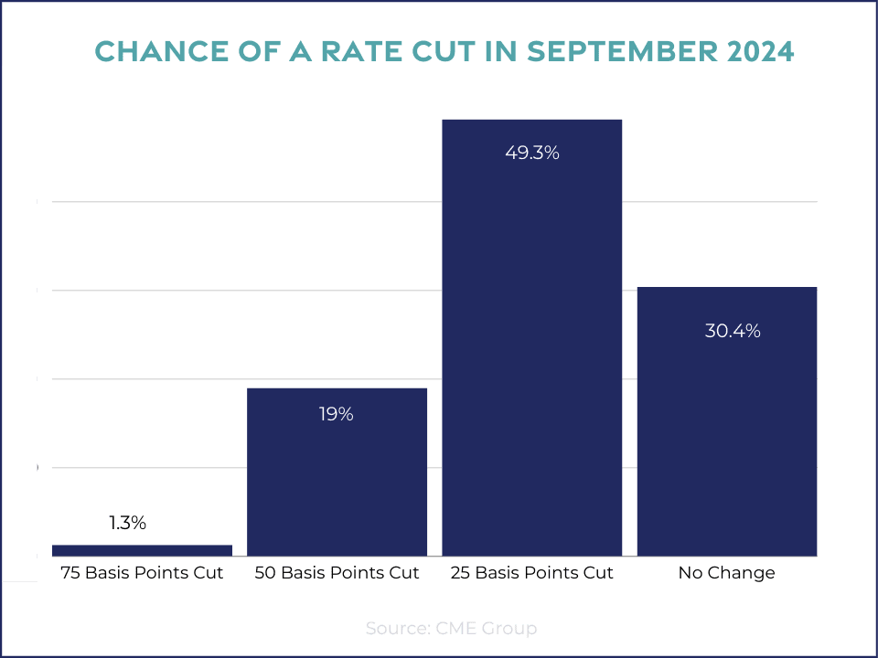 According to the CME Group, there's a 69.6% chance that the Federal Reserve cuts the federal funds rate at the September meeting.