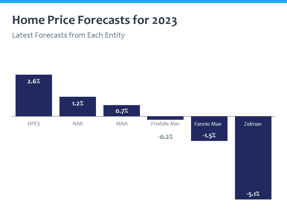 These are the Home Price Forecasts from the top 6 industry experts – the Home Price Expectations Survey (HPES), the National Association of Realtors® (NAR), the Mortgage Bankers Association (MBA), Freddie Mac, Fannie Mae, and Zelman. Overall, the predictions are a little bit up and a little bit down – on average a roughly neutral, flat home price appreciation for 2023.