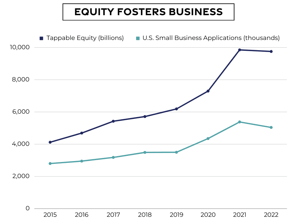 There is an extraordinary correlation between small business applications and tappable equity (80% of the home’s value). The equity you earn as a homeowner can be borrowed against to not only open a business, but to pay off debt, invest, or renovate. Your home equity can provide generational wealth and financial freedom.
