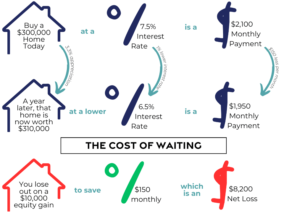 And by this time next year homes are likely to have appreciated in value between 3% and 5%. For an average-priced home, that could mean you wait a year to save $150 a month on your mortgage payment, but lose out on the opportunity to gain $10,000 in equity.