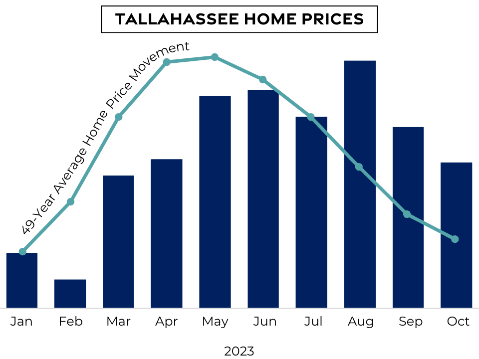 When we try to overlay the 49-year average seasonal home price movement over this year’s sales in Tallahassee, we see that home prices locally may not be decelerating as quickly as they have historically.