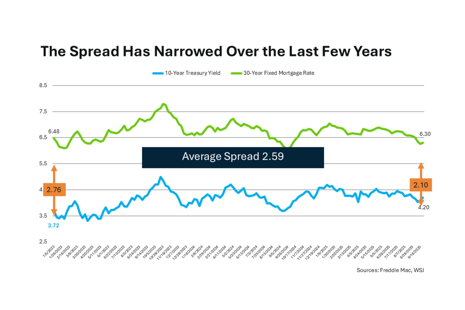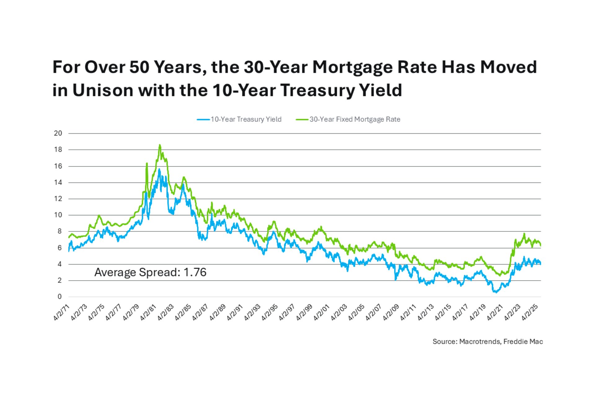 A great indicator of mortgage rates is the 10-year treasury yield. Why? Because for over 50 years, the 10-year treasury yield and the 30-year mortgage rate have moved in unison with each other - when the 10-year treasury goes up, mortgage rates tend to follow, and when it comes down, mortgage rates tend to come down as well. However, there is something called a “spread.” The spread is the difference between the yield and the rate. This difference, historically, averages about 1.76. What this means is that if the 10-year treasury yield is 6.00, then the 30-year mortgage rate is about 7.76 (1.76%, or 176 basis points, higher). It is sort of a symbiotic relationship.