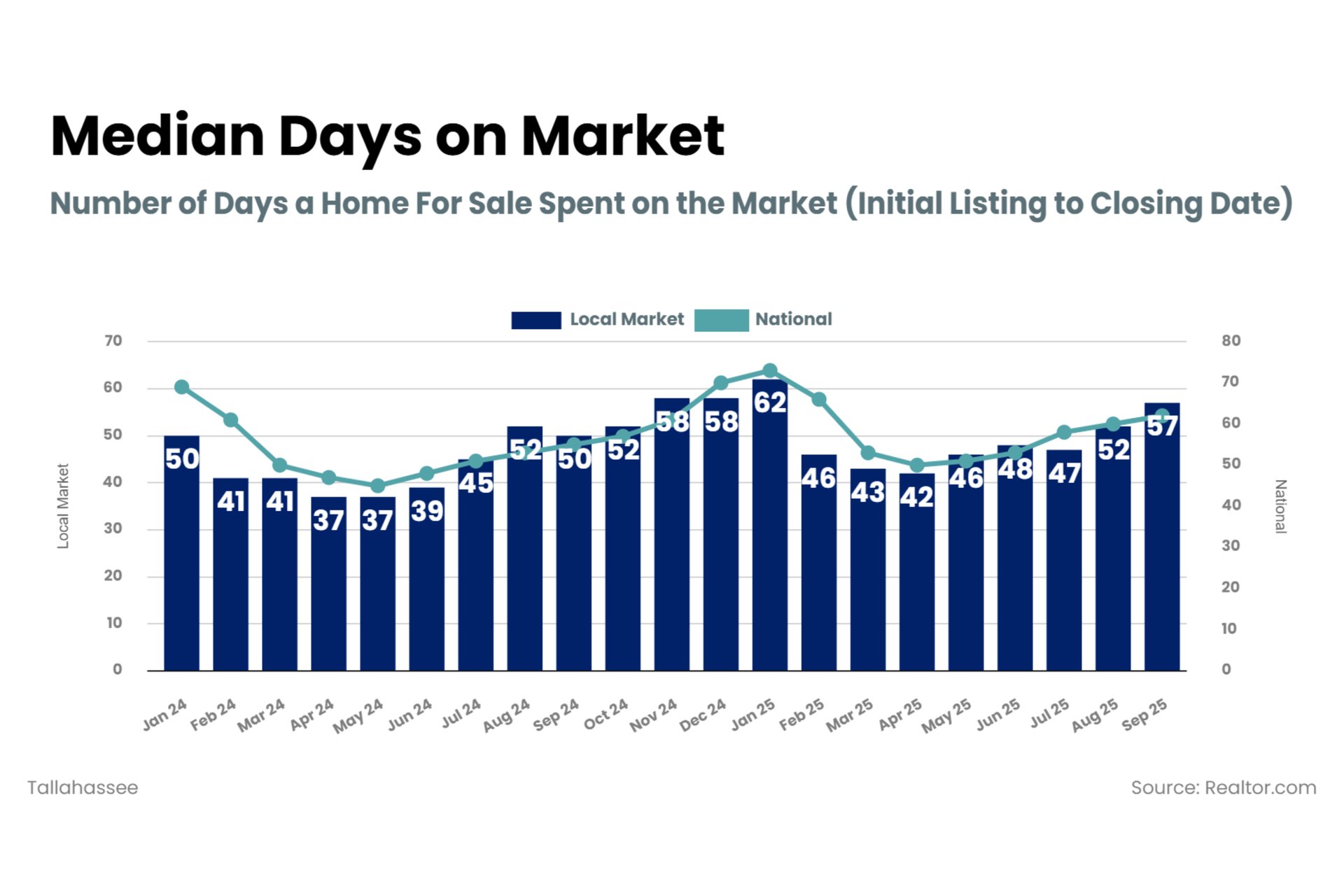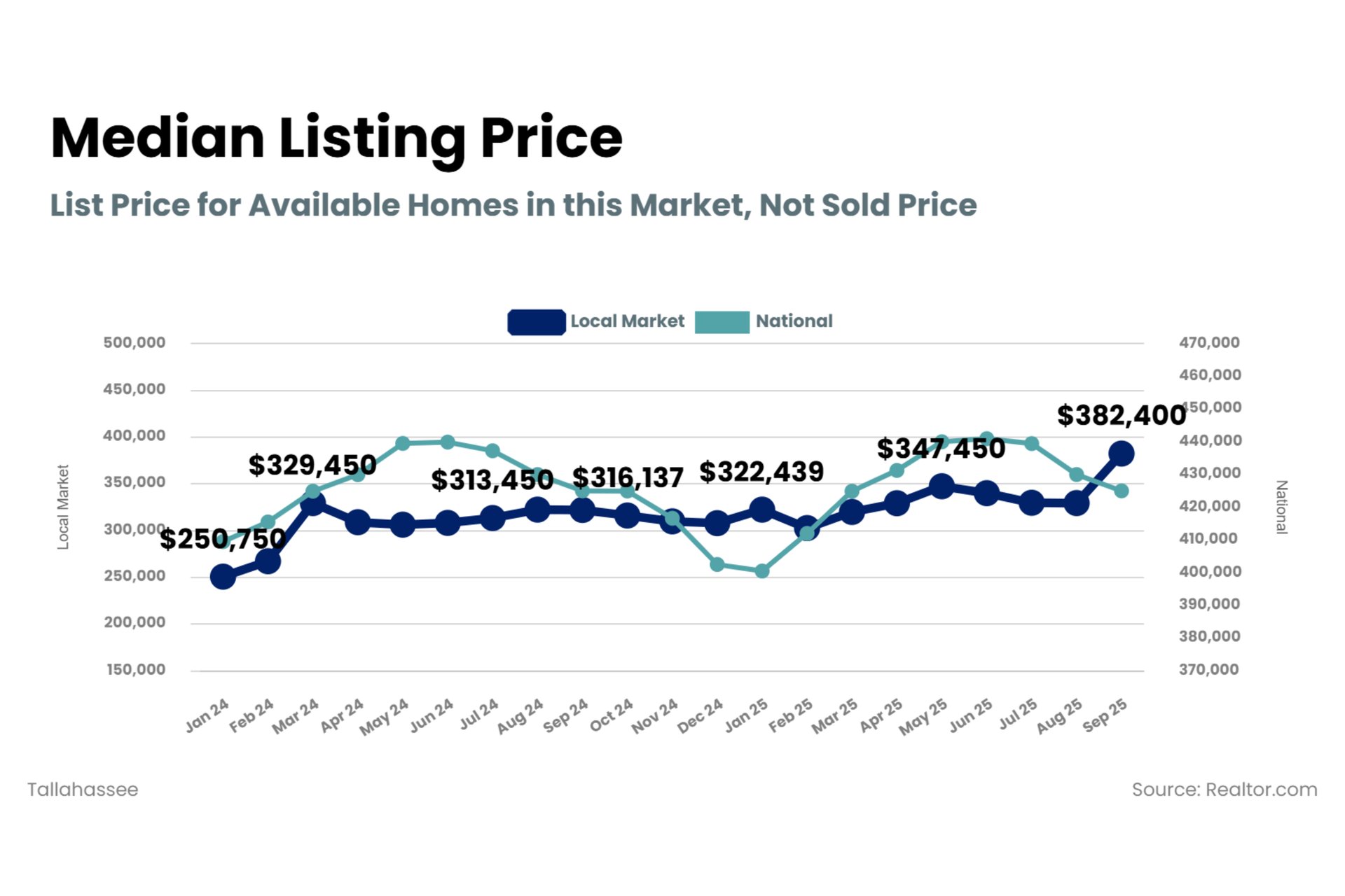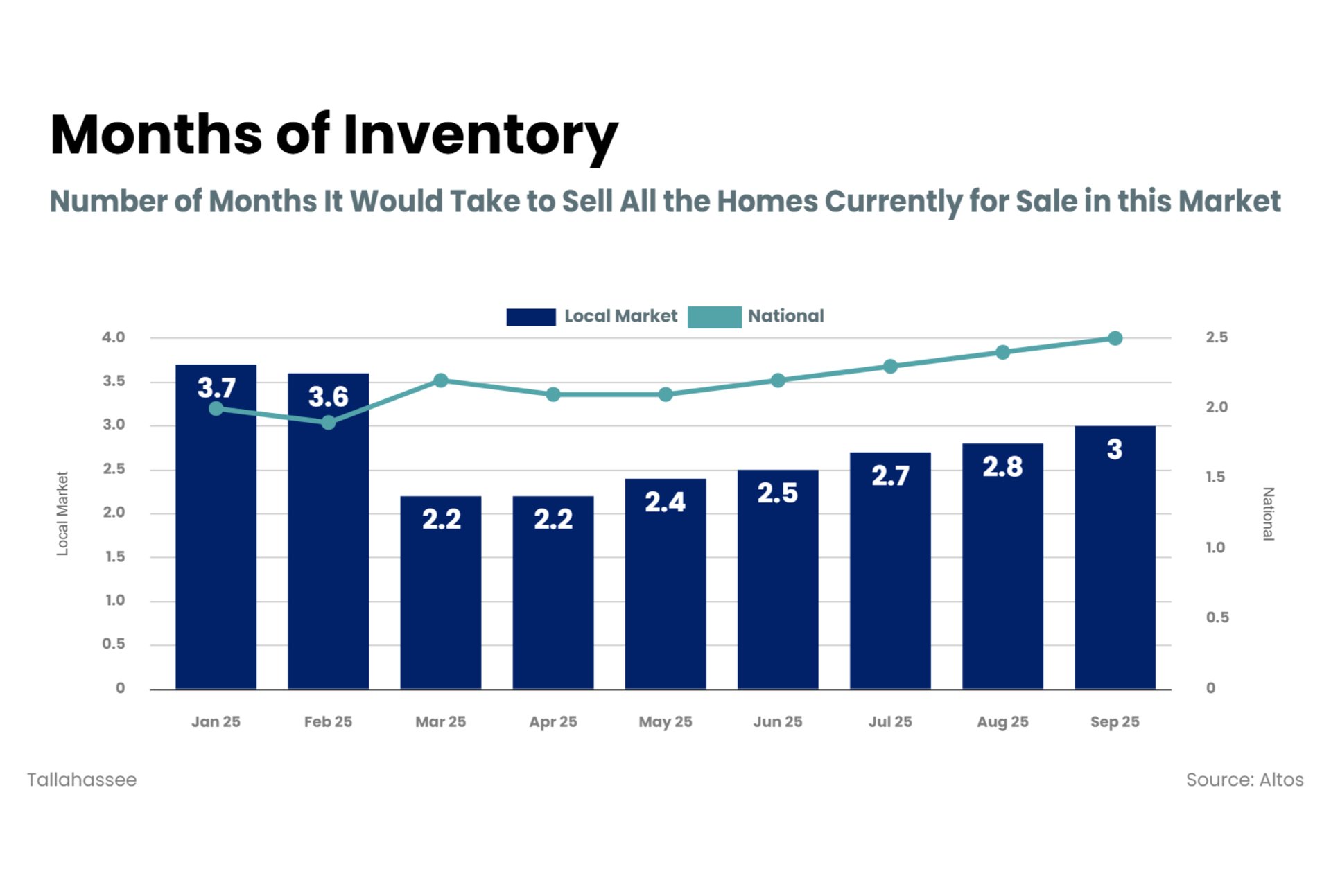 These are all indicators of prices moderating – which they are doing nationally. However, locally, Tallahassee seems to be a bit of an outlier for last month – with an increase in listing prices. It will be interesting to revisit this graphic on next month’s market update to see if we fall back closer to that national trend.