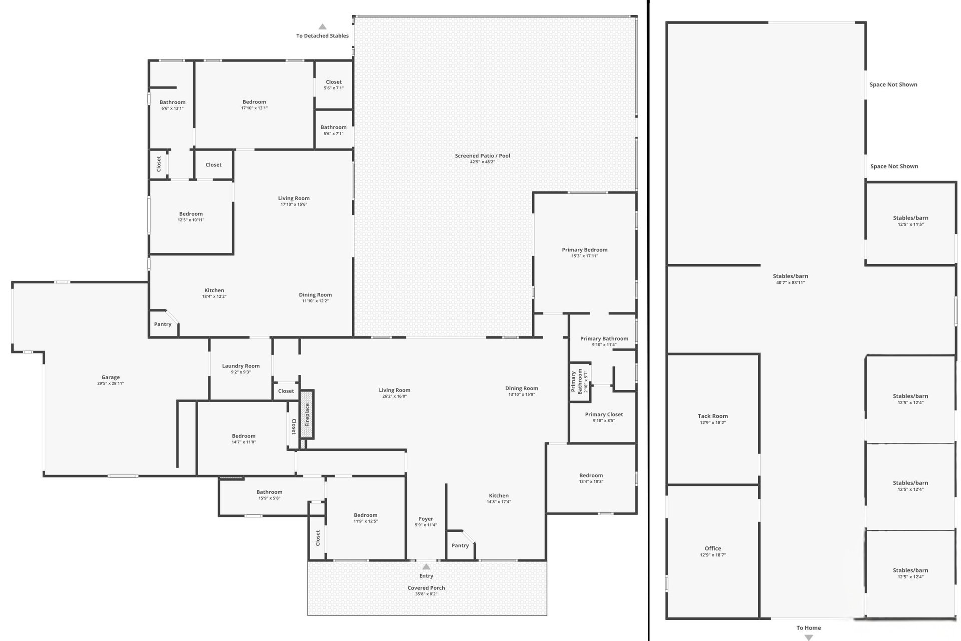 Modern farmhouse estate with an attached guest home, screened-in heated saltwater swimming pool, outdoor kitchen, barn, tack room, stables, garden, and 3-car garage – all on 8 meticulously maintained acres.